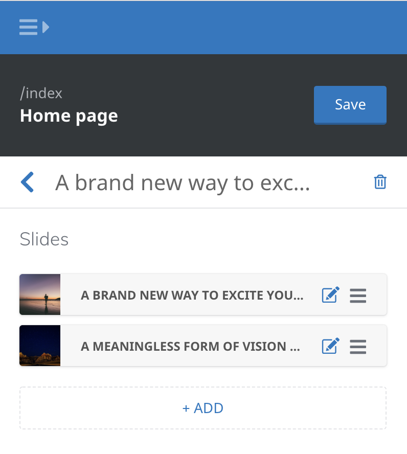 Using the editor, users are able to fully manage (add, update, re-order, nest, and delete) the list of blocks within a section.